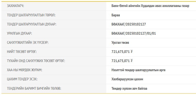 Тендер шалгаруулалтын дугаар: БӨАХААГ/20250102127
