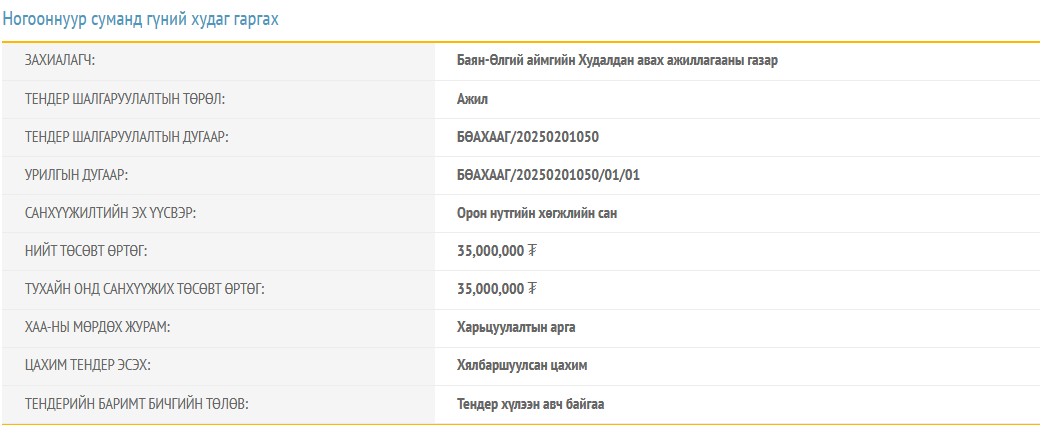 Дэлгэрэнгүй мэдээллийг доорх холбоосоор авна уу. https://user.tender.gov.mn/mn/invitation/detail/1743569858728