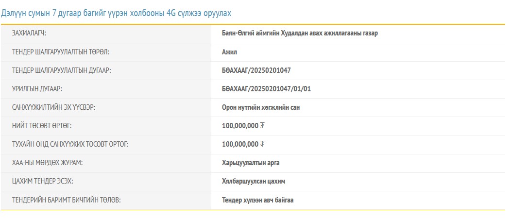 Дэлгэрэнгүй мэдээллийг доорх холбоосоор авна уу. https://user.tender.gov.mn/mn/invitation/detail/1743570001638