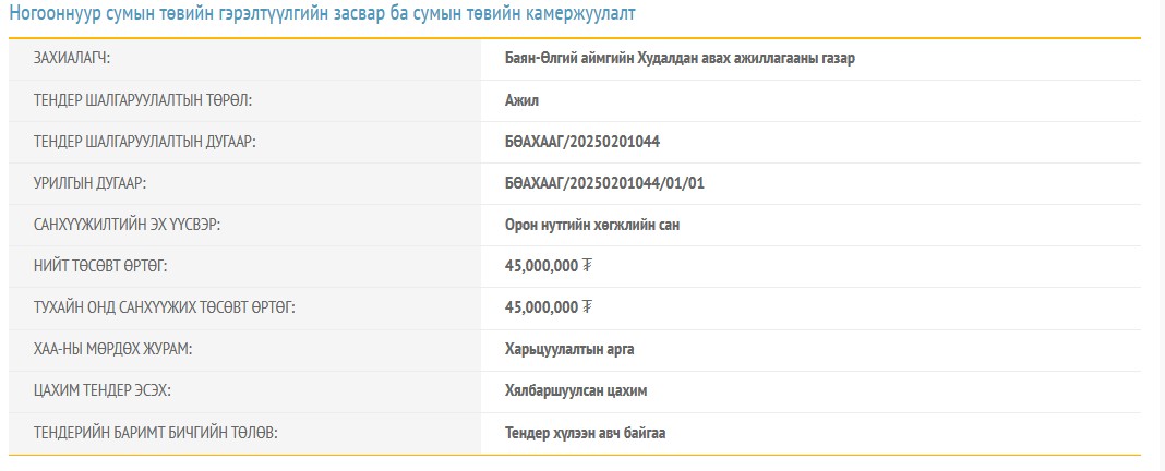 Дэлгэрэнгүй мэдээллийг доорх холбоосоор авна уу. https://user.tender.gov.mn/mn/invitation/detail/1743570001638