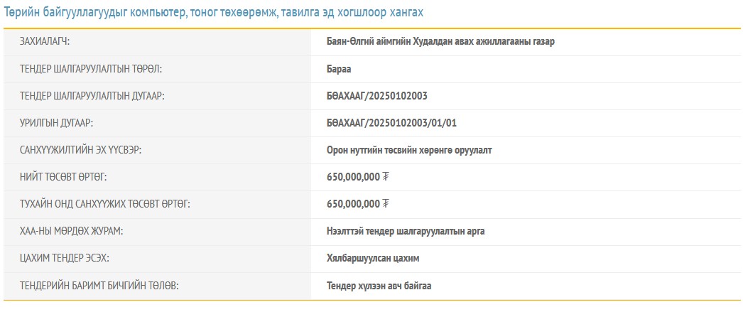 Дэлгэрэнгүй мэдээллийг доорх холбоосоор авна уу. https://user.tender.gov.mn/mn/invitation/detail/1743570270650