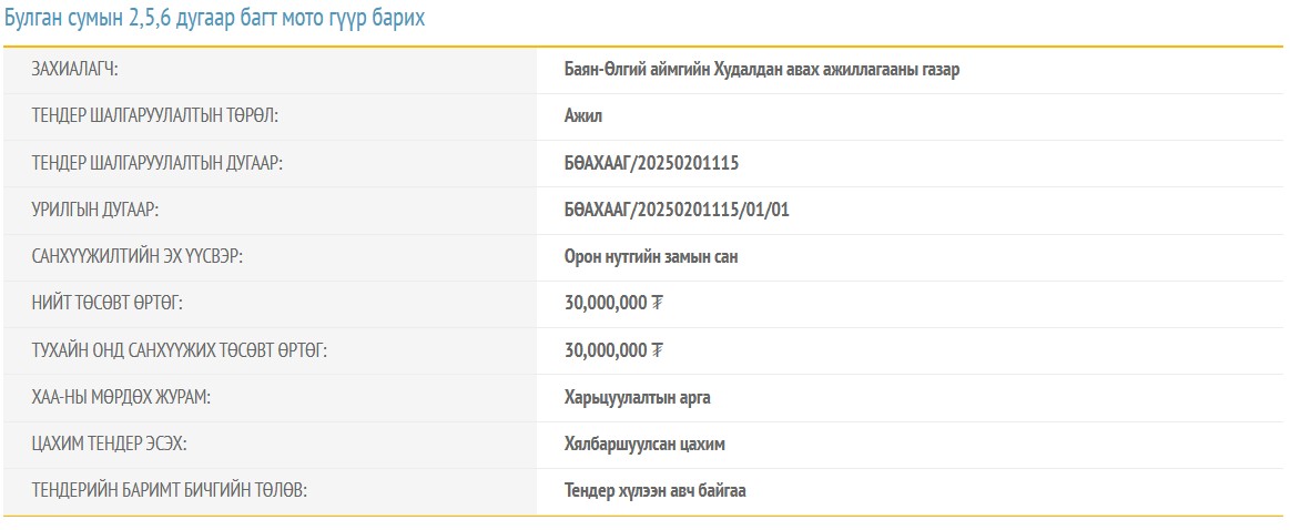 Дэлгэрэнгүй мэдээллийг доорх линкээр авна уу. https://user.tender.gov.mn/mn/invitation/detail/1743570458249