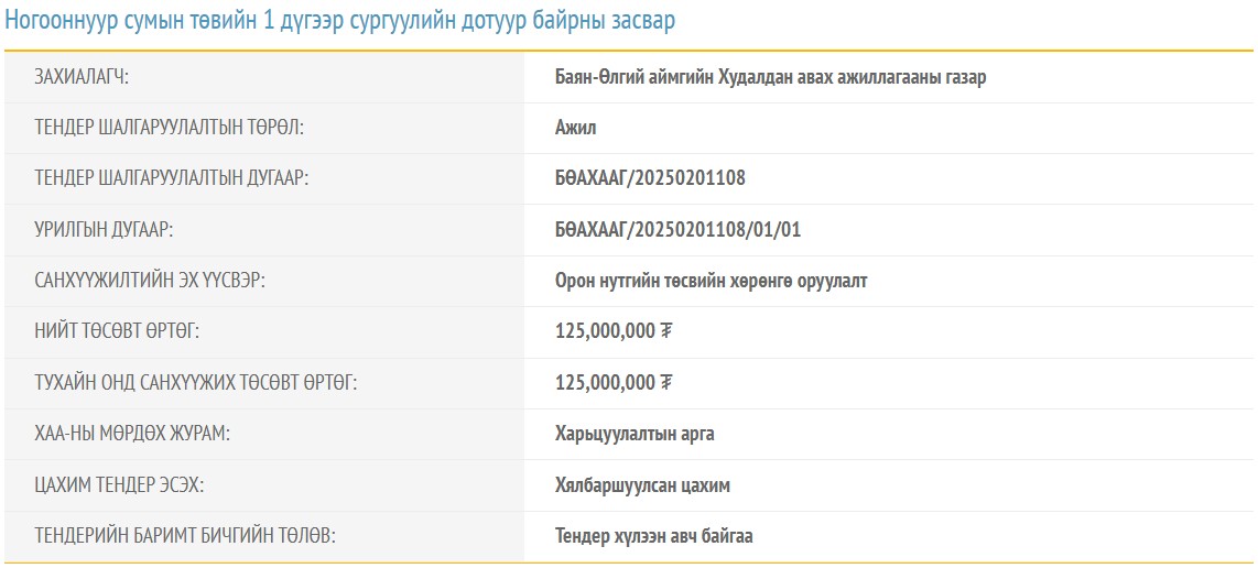 Дэлгэрэнгүй мэдээллийг доорх линкээр авна уу. https://user.tender.gov.mn/mn/invitation/detail/1743570534218