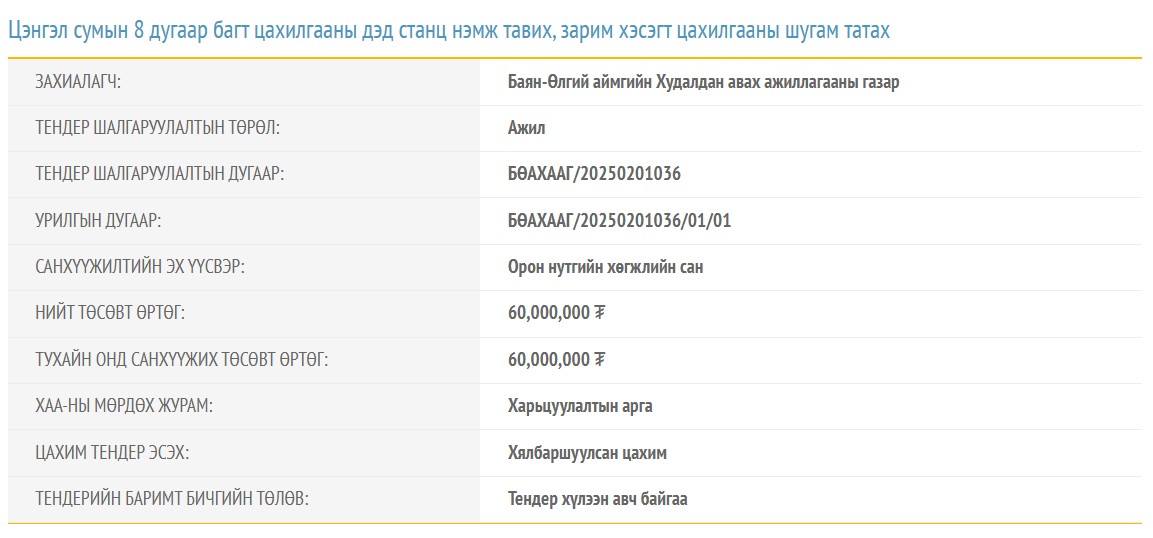 Дэлгэрэнгүй мэдээллийг доорх линкээр авна уу. https://user.tender.gov.mn/mn/invitation/detail/1746497150819