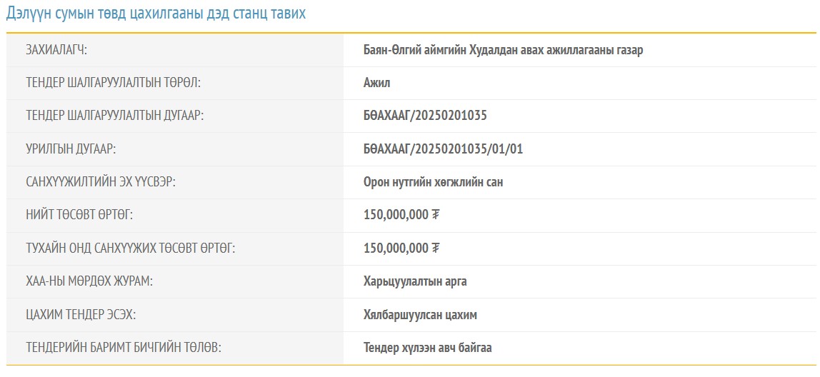Дэлгэрэнгүй мэдээллийг доорх линкээр авна уу.https://user.tender.gov.mn/mn/invitation/detail/1746497152153